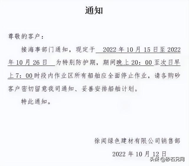 廣東省湛江市徐聞綠色建材有限公司發布《通知》,接海事部門通知,現定于2022年10月15日至2022年10月26日為特別防護期,期間晚上20:00至次日早上7:00時段內作業區所有船舶應全面停止作業,請各購砂客戶密切留意我司通知、妥善安排船舶計劃。