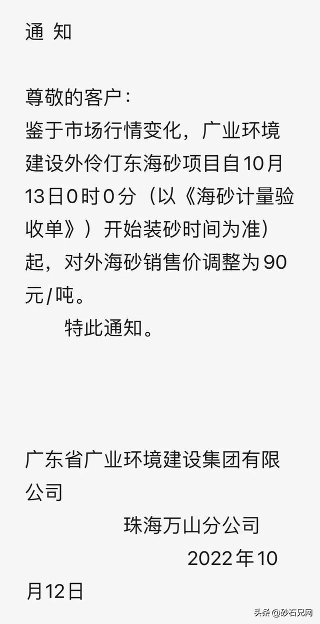 廣東省廣業環境建設集團有限公司珠海萬山分公司,近日發布《通知》,鑒于市場行情變化,廣業環境建設外伶仃東海砂