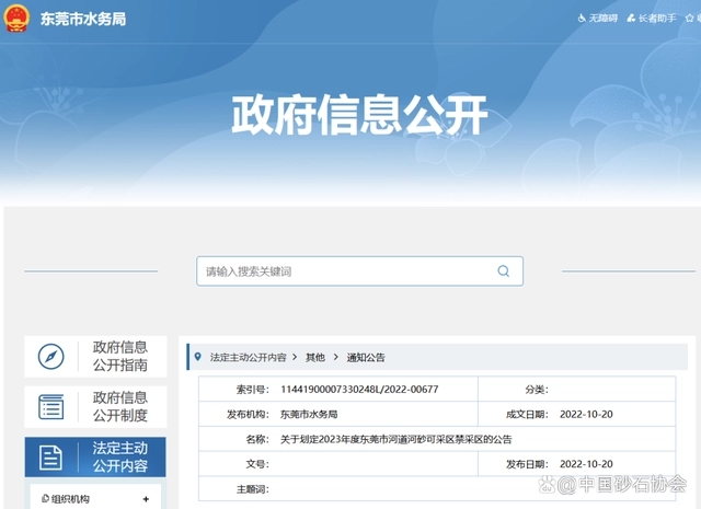 近日,廣東東莞市水務局發布2023年度河道河砂可采區禁采區公告,劃定東莞市域內所有河道均為河砂禁采區。