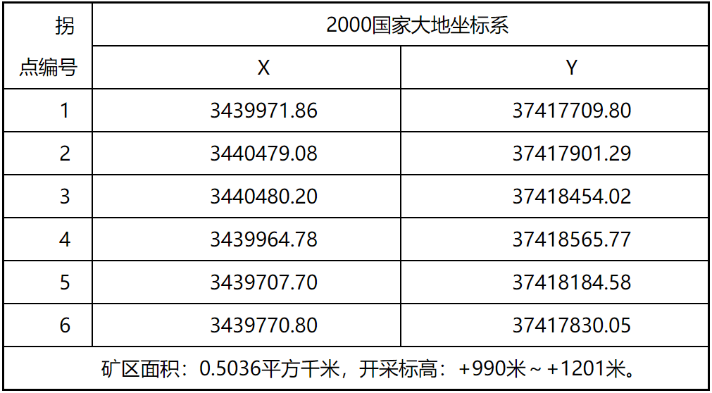 (六)礦區范圍:礦區范圍由6個拐點圈定,拐點坐標為