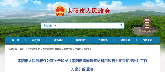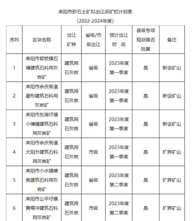 獲悉,湖南省耒陽市人民政府辦公室關于印發《耒陽市普通建筑材料用砂石土礦采礦權出讓工作方案》,2025年底前,22個新設、擴界砂石土礦開采規劃區塊采取招標、拍賣、掛牌方式,按計劃投放時序公開競爭出讓,競得后依法辦理采礦許可證登記,順利開展綠色礦山建設。礦產拍賣起始價,衡陽地區按可采資源儲量不低于4元/噸確定掛牌起始價。