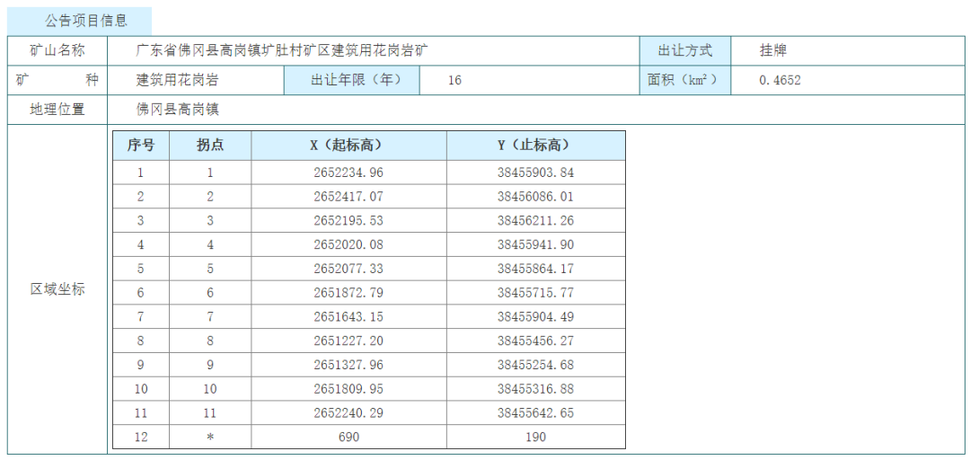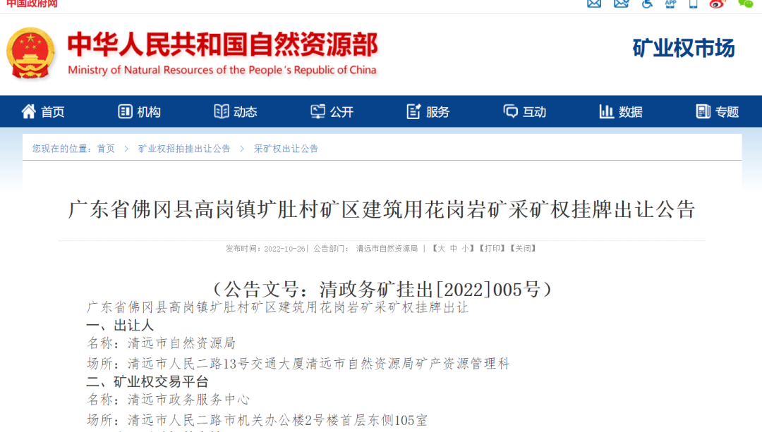 廣東省佛岡縣高崗鎮壙肚村礦區建筑用花崗巖礦采礦權掛牌出讓公告
