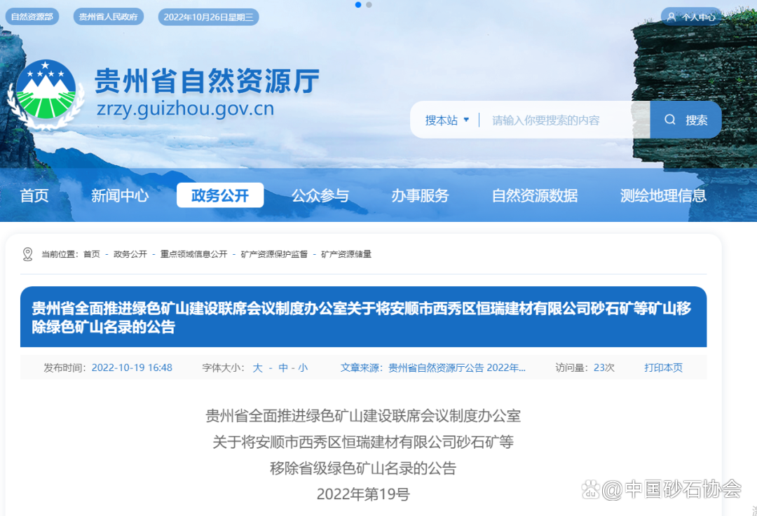 10月19日,貴州省自然資源廳發布2022年【19】號公告。按自然資源部辦公廳《關于開展綠色礦山“回頭看”的通知》(自然資辦函〔2022〕168號)和貴州省全面推進綠色礦山建設聯席會議制度辦公室《關于開展綠色礦山“回頭看”的通知》的要求,對貴州省全面開展綠色礦山“回頭看”核查工作。
