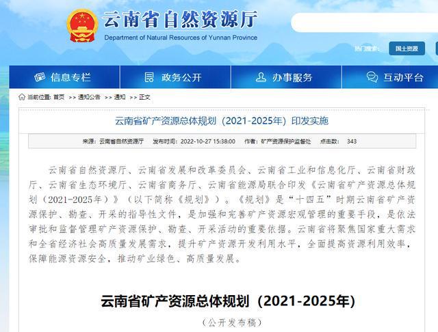 獲悉,云南省為聚焦國家重大需求和全省經濟社會高質量發展需求,提升礦產資源開發利用水平,全面提高資源利用效率,保障能源資源安全,推動礦業綠色、高質量發展。云南省自然資源廳等7部門聯合印發《云南省礦產資源總體規劃(2021-2025年)》(以下簡稱《規劃》)。