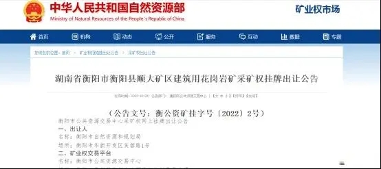10月29日,衡陽市自然資源和規劃局發布湖南省衡陽市衡陽縣順大礦區建筑用花崗巖礦采礦權出讓公告。礦區可采資源儲量848.92萬噸。