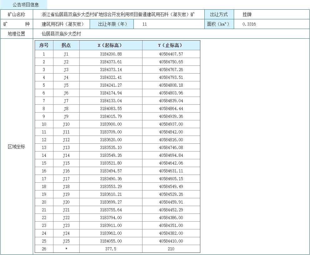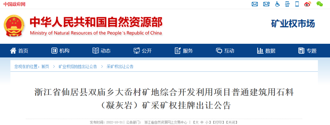 10月31日,浙江省自然資源網上交易中心發布公告,掛牌出讓浙江省仙居縣雙廟鄉大岙村礦地綜合開發利用項目普通建筑用石料(凝灰巖)礦,擬出讓11年(含基建期1年),起始價2.74億元。