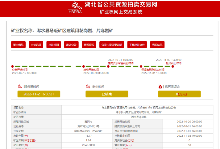 該礦區位于湖北省黃岡市浠水縣清泉鎮,礦區面積1.36平方公里,開采礦種建筑用花崗巖、片麻巖礦,出讓范圍內擁有資源儲量2.98億噸,生產規模2000萬噸/年,出讓年限15.77年(含基建期1.5年)。