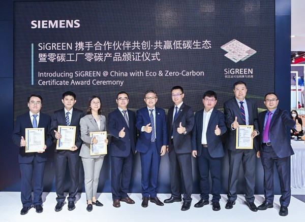 中國信息通信研究院、TUV南德、供應商合作伙伴大同齒輪傳動(昆山)股份有限公司和江陰華新精密科技股份有限公司在進博會現場共同見證了頒證儀式。未來,西門子將攜手各方合作伙伴,推進SiGREEN生態網絡共建,共同加速產業脫碳進程。