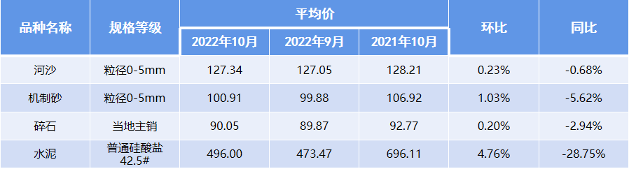 河砂、機制砂、碎石價格較為平穩。10月份全省河砂(粒徑0-5mm)、機制砂(粒徑0-5mm)、碎石(當地主銷)每噸均價分別為127.34元、100.91元、90.05元,環比分別微漲0.23%、1.03%、0.20%,同比分別下跌0.68%、5.62%、2.94%。
