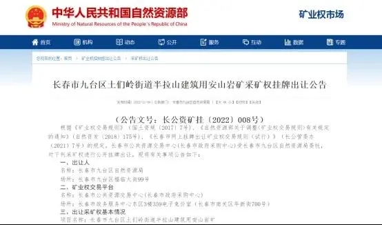 11月4日,長春市九臺區(qū)自然資源局發(fā)布了長春市九臺區(qū)土們嶺街道半拉山建筑用安山巖礦采礦權。資源儲量達10603.60萬立方米。