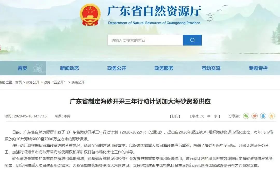 砂石協會了解,2020年5月廣東省自然資源廳印發了《廣東省海砂開采三年行動計劃(2020-2022年)》,提出2020-2022年共安排海砂開采區25片和海砂開采儲備區14片,總面積約67.23平方千米,主要分布在湛江、珠海、江門、陽江、汕尾、揭陽、汕頭和茂名等8市海域。《計劃》要求廣東省三年最少開采海砂(含泥)3億立方米,每年最少組織6-7片海砂資源出讓,每年開采海砂(含泥)約1億立方米,有效供應海砂6000-7000萬立方米。