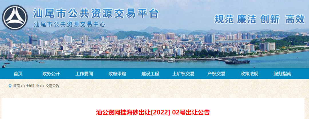 汕尾市海砂開采海域使用權和采礦權網上公開掛牌出讓公告