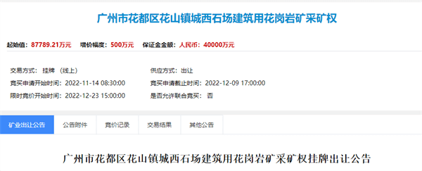 近日,從廣州公共資源交易中心獲悉, 今年廣州首宗年產千萬噸級建筑用花崗巖礦掛牌出讓,保有資源儲量近7000萬方,起始價8.8億,出讓年限20年。
