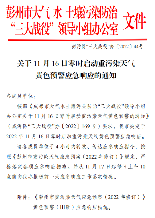 四川彭州市11月16日零時啟動重污染天氣黃色預警,啟動黃色預警期間要求: