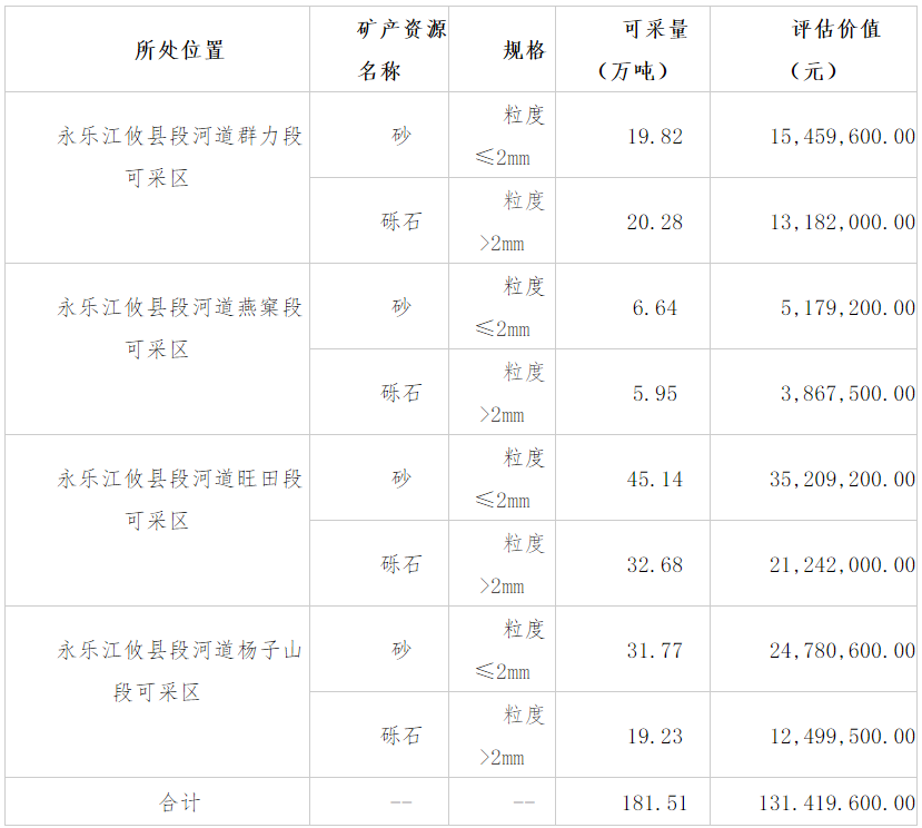 永樂江攸縣段出讓河道全長9.5km,劃定了禁采區域河段5.842km,可采區域河段3.658km,不設保留區。河道寬度150m~250m,平均斷面寬約為200m,河道自然彎曲,正常水深1.0m~3.0m,河段內有灘涂13處,其中河中間3處,左岸5處,右岸5處。本次拍賣標的為永樂江攸縣段河道砂石開采權,根據攸縣人民政府批復的《永樂江攸縣段河道釆砂規劃》,可采量約為181.51萬噸,具體情況如下: