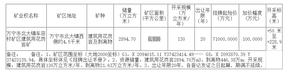近日,海南省網上掛牌出讓萬寧市北大鎮車田村礦區建筑用花崗巖礦采礦權,該礦權出讓保有資源儲量超2894.70萬立方米(超8000萬噸),年開采規模130萬方,起始價7.1億,出讓年限20年。須出資建設與礦區有關的配套設施及礦區周邊村莊相關的基礎設施項目,出資2.5億。