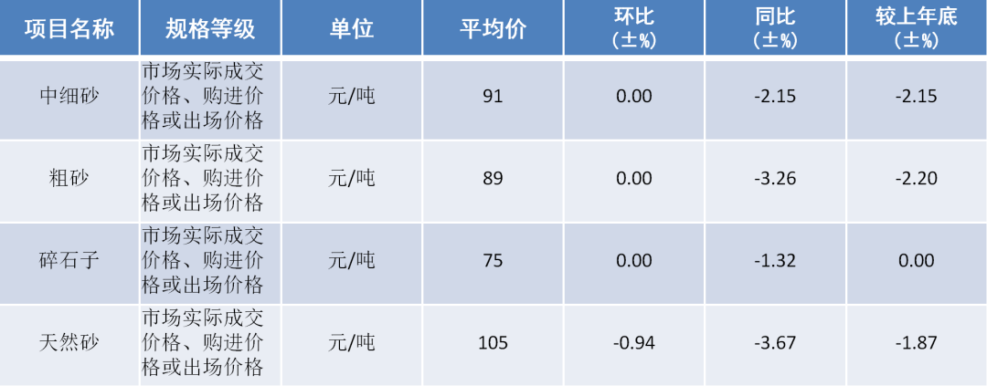 2022年10月,四川省中細砂平均價91元/噸,環比持平,同比下降2.15%,較上年底下降2.15%;粗砂平均價89元/噸,環比持平,同比下降3.26%,較上年底下降2.2%;碎石子平均價75元/噸,環比持平,同比下降1.32%,較上年持平;天然砂平均價105元/噸,環比下降0.94%,同比下降3.67%,較上年底下降1.87%。
