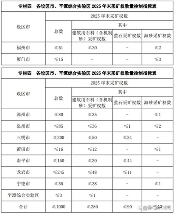 11月21日,福建省自然資源廳、發改委、工信廳、財政廳以及生態環境廳5部門聯合發布《福建省礦產資源總體規劃(2021-2025年)》(以下簡稱《規劃》),明確至2025年全省礦山總數控制在1000個以內,海砂采礦權數控制在10個以內,其中建筑用(含機制砂)礦山控制在280個以內、大中型礦山達到40%以上、廢棄礦山修復達到2萬畝。與上一輪規劃相比礦權降幅比例大。