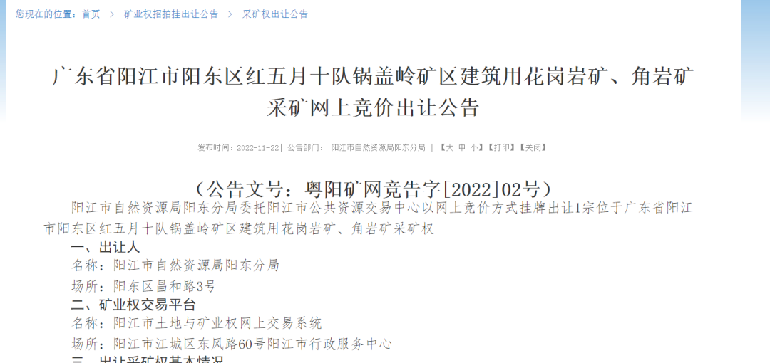 近日,陽江市自然資源局陽東分局掛牌出讓1宗位于廣東省陽江市陽東區紅五月十隊鍋蓋嶺礦區建筑用花崗巖礦、角巖礦采礦權。礦區資源儲量7186.58萬m3(約1.9億噸),擬出讓年限23.5年,起始價70806.28萬元。