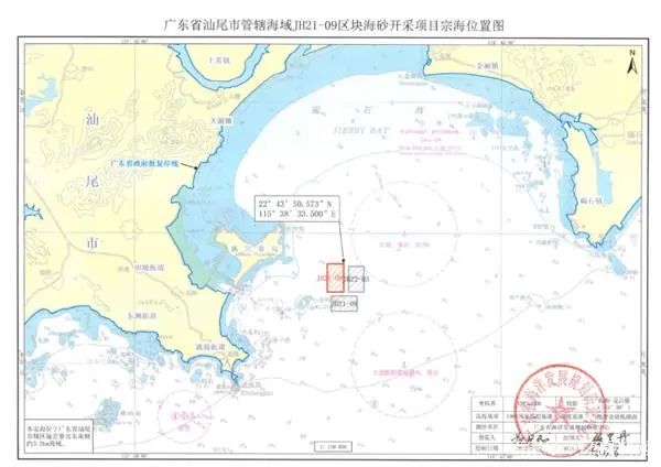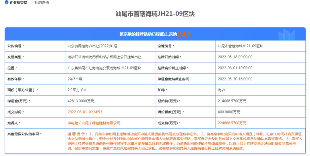 2022年6月,中電建(汕尾)綠色建材有限公司以超22.48億元成功拍下汕尾市管轄海域JH21-09區(qū)塊海砂開采海域使用權(quán)和采礦權(quán),海域面積2.3平方千米,海砂資源儲(chǔ)量4178.1萬立方米,可采資源量3531.65萬立方米,出讓年限2年7個(gè)月,年均最大控制開采量1368萬立方米(3625萬噸)。