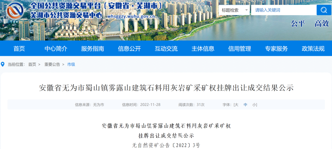 根據《中華人民共和國礦產資源法》《礦業權交易規則》《安徽省礦業權出讓管理辦法》等相關法律法規及文件規定,經無為市人民政府批準,無為市自然資源和規劃局在蕪湖市公共資源交易中心掛牌出讓的安徽省無為市蜀山鎮霧露山建筑石料用灰巖礦采礦權已成交,現將成交結果公示如下:
