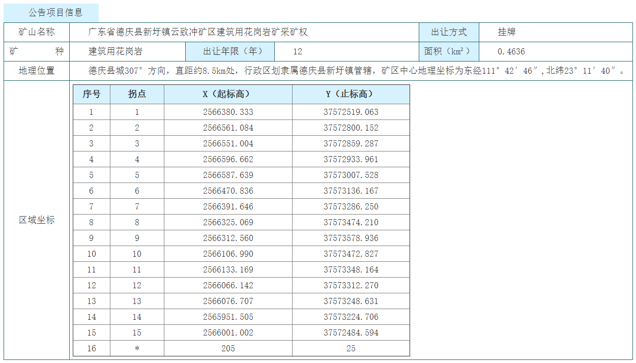 廣東省德慶縣新圩鎮云致沖礦區建筑用花崗巖礦采礦權采礦權掛牌出讓公告