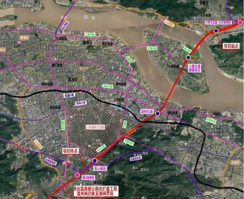 工程概況:項(xiàng)目起于樂清市北白象鎮(zhèn),甬臺溫高速公路大橋北互通處,接甬臺溫高速公路改擴(kuò)建工程溫州樂清樞紐至北白象段,沿線經(jīng)樂清市、永嘉縣、鹿城區(qū)、龍灣區(qū)和甌海區(qū)5個縣市區(qū),終于甌海區(qū)茶山街道,甬臺溫高速公路南白象樞紐北側(cè),接甬臺溫高速公路改擴(kuò)建工程溫州南白象至浙閩界段。路線全長約14.73公里;設(shè)互通式立體交叉4處;互通收費(fèi)站3處;增設(shè)服務(wù)區(qū)1處(與七都互通合建),以及配置必要的交通輔助管理用房和設(shè)施。項(xiàng)目總體采用雙向八車道高速公路標(biāo)準(zhǔn),設(shè)計速度100公里/小時,整體式路基寬度41米;局部采用兩側(cè)分離新建三車道方案,與既有高速形成“3+2+2+3”的十車道斷面。