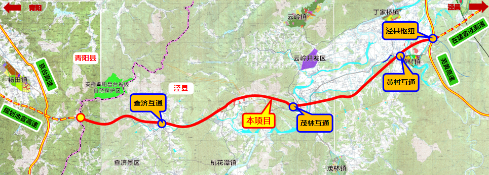 工程概況:項(xiàng)目起自涇縣黃村鎮(zhèn)九義村,接蕪湖至黃山高速公路及在建宣城至涇縣高速公路,往西延伸,經(jīng)涇縣黃村鎮(zhèn)、丁家橋鎮(zhèn)、桃花潭鎮(zhèn),止于涇縣與青陽縣交界竹溪村,接規(guī)劃寧國至樅陽高速公路池州段。采用雙向四車道的高速公路標(biāo)準(zhǔn)設(shè)計,路基寬度26.0米,設(shè)計速度100公里/小時。全線設(shè)置隧道3045m/3座,橋梁總長9229m/14座,涵洞49道,通道55道;設(shè)置互通式立交4座,服務(wù)區(qū)1處,收費(fèi)站3處,養(yǎng)護(hù)中心和管理中心各1處。計劃于2022年年底開工。