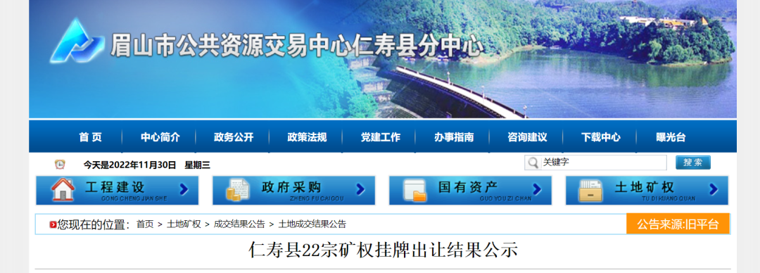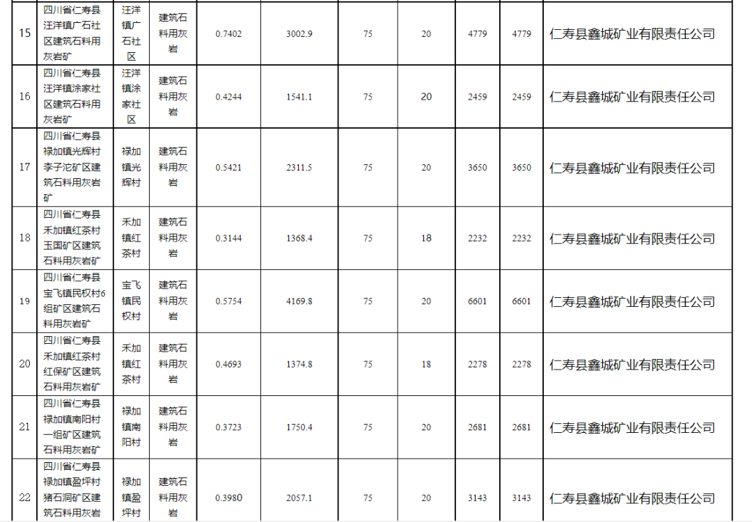 近日,四川省眉山市公共資源交易中心發布了,仁壽縣22宗礦權掛牌出讓結果公示,其中含有8宗砂石礦均為建筑石料用灰巖,據統計,總儲量1.75億噸,總年產量600萬噸,總成交價2.78億元。