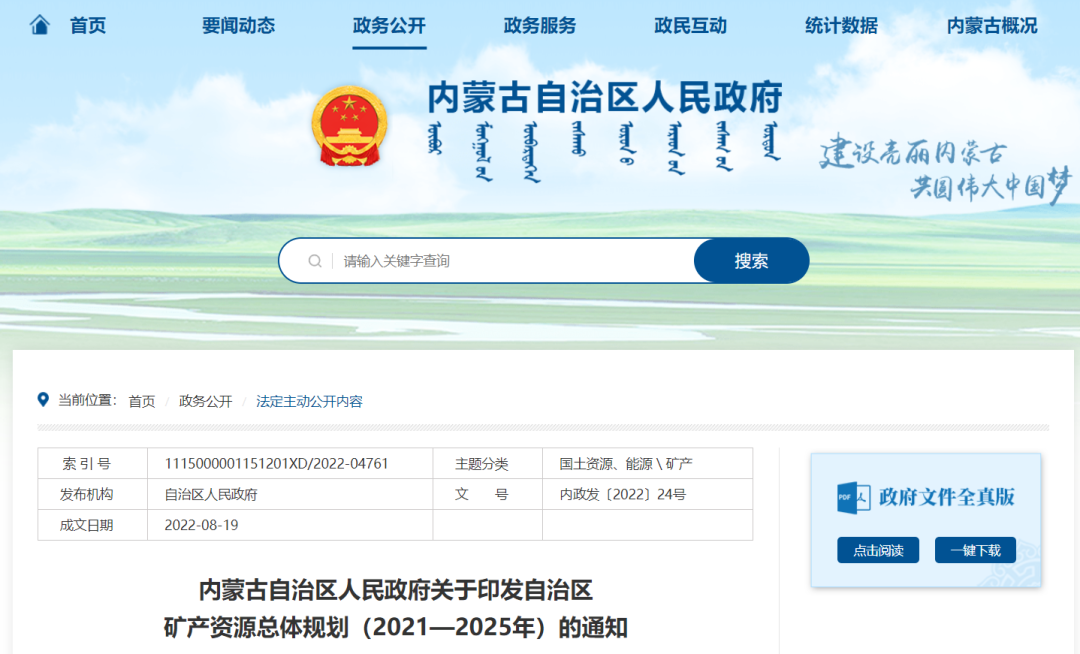 2022年8月19日,內蒙古自治區人民政府印發了《自治區礦產資源總體規劃(2021—2025年)》。