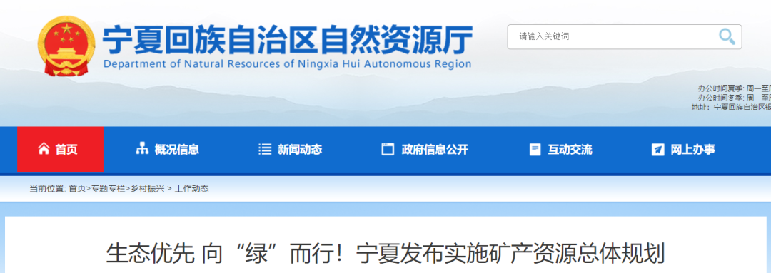 8月,獲自然資源部批復,由寧夏自然資源廳、發展和改革委員會、工業和信息化廳、財政廳、生態環境廳等部門聯合發布的《寧夏回族自治區礦產資源總體規劃(2021-2025年)》正式實施。