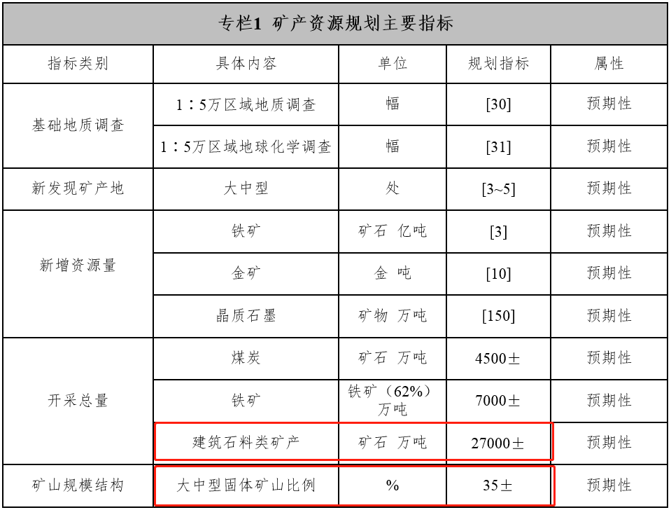 合理確定礦產資源開采總量,規劃期內預期年礦石開采總量1.7億噸左右,礦山數量控制在1600個以內,大中型礦山比例達到20%。有序開展普通建筑用砂石土的“凈礦”出讓試點工作。