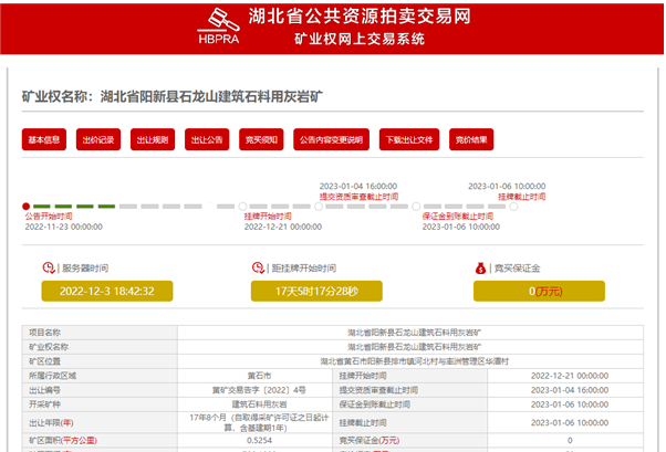 根據公告,此次公開掛牌的湖北省陽新縣石龍山建筑石料用灰巖礦采礦權將以“凈礦”形式出讓,礦區位于黃石陽新縣排市鎮河北村與率洲管理區華潭村,距離陽新火車站運距25公里,至水運碼頭50公里,物流便利。礦區面積0.5254平方公里。礦區出讓范圍內擁有建筑石料用灰巖資源儲量3552.3萬立方米(9662.4萬噸),年生產規模500萬噸,出讓年限17年8個月(含基建期1年)。網上掛牌時間為2022年12月21日至2023年1月6日,起始價2.12億元。