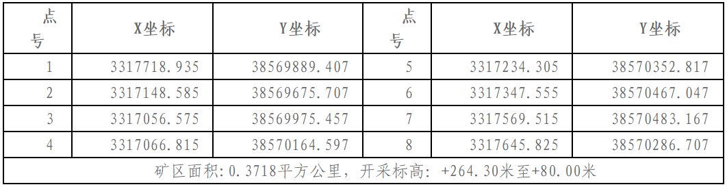 (八)礦區范圍:根據《關于劃定湖北省大冶市靈鄉鎮紅峰建筑石料用石灰巖礦礦區范圍的批復》(黃自然資規批〔2022〕7號),擬出讓采礦權礦區面積0.3718平方公里,開采標高+264.30米至+80.00米,拐點坐標為(大地2000坐標系):