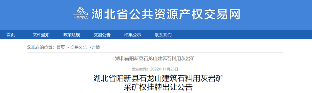 湖北省陽新縣石龍山建筑石料用灰巖礦采礦權掛牌出讓公告
