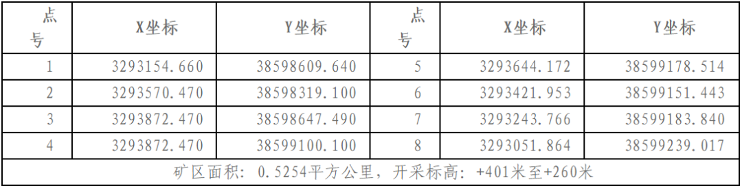(八)礦區范圍:根據《關于劃定湖北省陽新縣石龍山建筑石料用灰巖礦礦區范圍的批復》(黃自然資規批〔2021〕56號),擬出讓采礦權礦區面積0.5254平方公里,開采標高+401米至+260米,拐點坐標如下(大地2000坐標系):