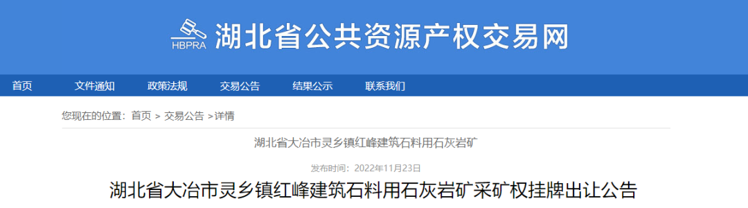 湖北省大冶市靈鄉鎮紅峰建筑石料用石灰巖礦采礦權掛牌出讓公告