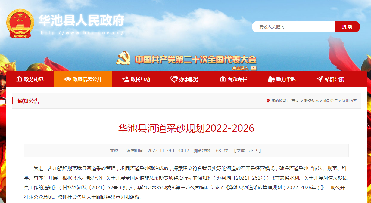 砂石開采經營模式,確保河道采砂“依法、規范、科學、有序”開展。根據《水利部辦公廳關于開展全國河道非法采砂專項整治行動的通知》(辦河湖〔2021〕252號)《甘肅省水利廳關于開展河道采砂試點工作的通知》(甘水河湖發〔2021〕52號)要求,華池縣水務局委托第三方公司編制完成了《華池縣河道采砂管理規劃(2022-2026年)》,現公開征求公眾意見。歡迎社會各界人士踴躍提出意見和建議。