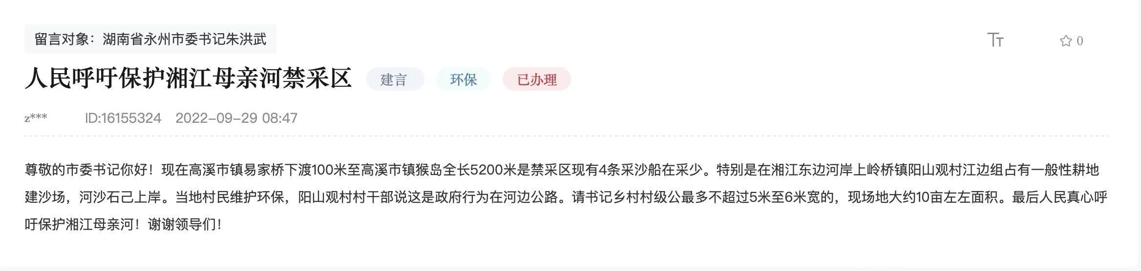 “高溪市鎮易家橋下渡100米至高溪市鎮猴島全長5200米是禁采區,現有4條采砂船在采砂。”近日,湖南永州的一名網友在“領導留言板”留言,反映河道亂開采問題,呼吁保護湘江母親河。