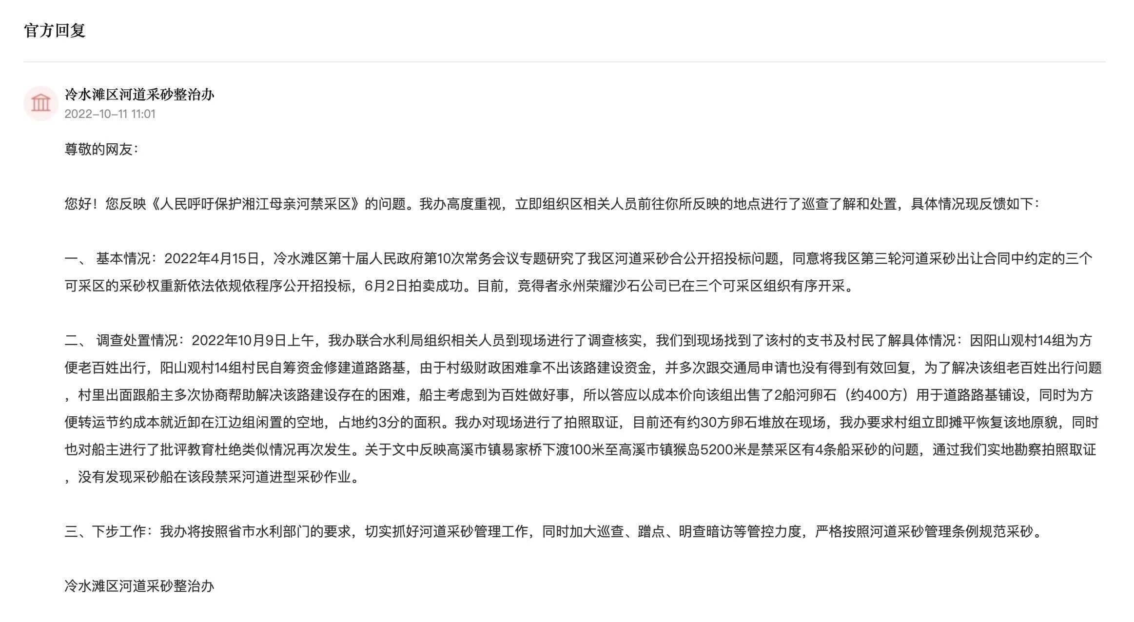湖南省永州市冷水灘區河道采砂整治辦接到網友留言后,立即組織相關人員前往當地巡查了解,并將具體情況在“領導留言板”上進行反饋。