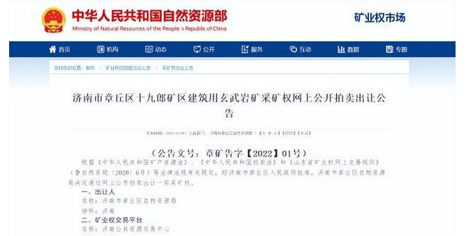 12月5日,經濟南市章丘區人民政府批準,濟南市章丘區自然資源局通過網上公開拍賣出讓濟南市章丘區十九郎礦區建筑用玄武巖礦。
