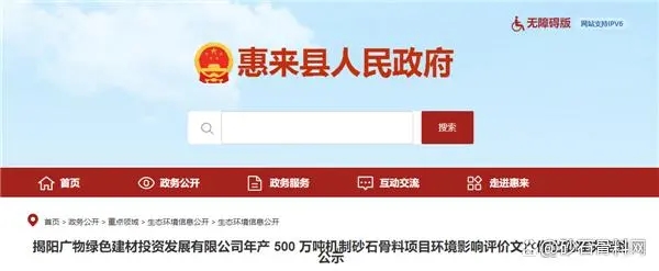 近日,廣東省揭陽市惠來縣人民政府批準并公示揭陽廣物綠色建材投資發展有限公司(以下簡稱揭陽廣物)年產500萬噸機制砂石骨料項目環境影響評價。