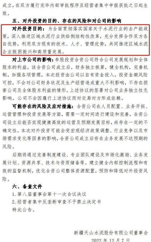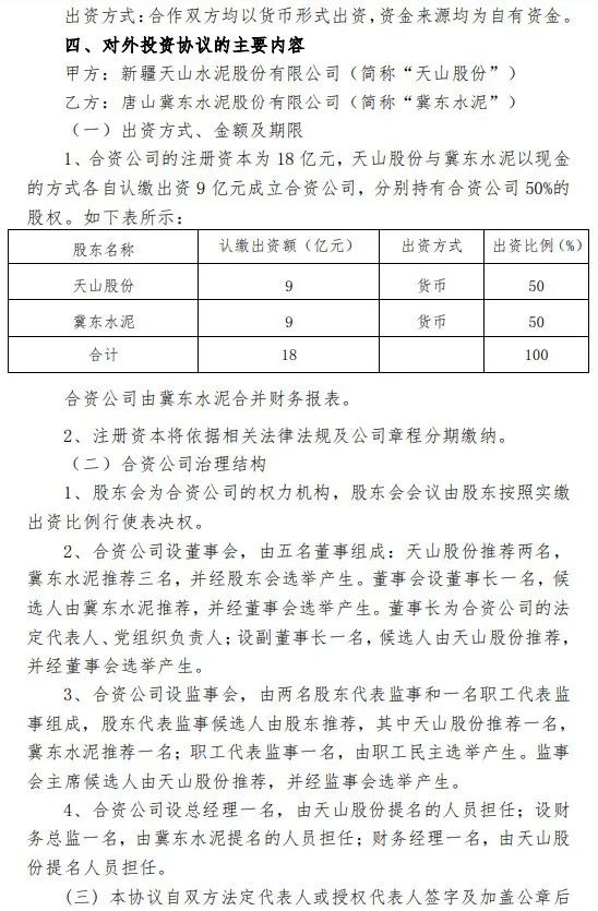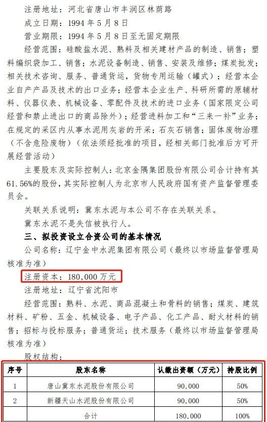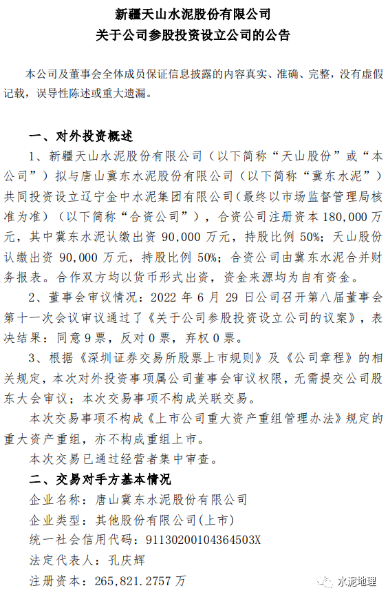 天山股份12月7日公告,公司擬與冀東水泥共同投資設立遼寧金中水泥集團有限公司(最終以市場監督管理局核準為準),合資公司注冊資本18億元,其中冀東水泥認繳出資9億元,持股比例50%;天山股份認繳出資9億元,持股比例50%;合資公司由冀東水泥合并財務報表。合作雙方均以貨幣形式出資,資金來源均為自有資金。