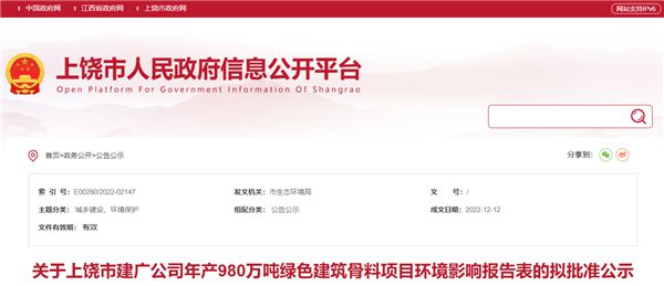 近日,江西省上饒市人民政府對上饒市建廣綠色建筑材料有限公司(以下簡稱上饒建廣)年產980萬噸綠色建筑骨料項目環境影響報告表予以批準公示。