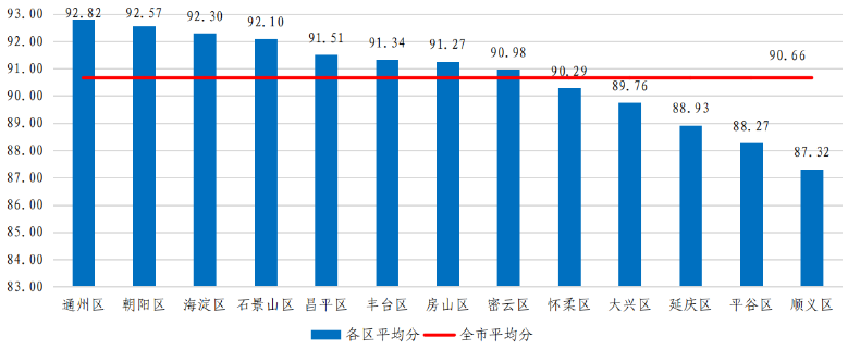 從各區評估得分情況來看,現場評估平均分較高的為通州區、朝陽區、海淀區,分數較低的為平谷區和順義區。各區企業現場檢查平均分見圖1。(各區企業現場評估得分情況詳見附件1)