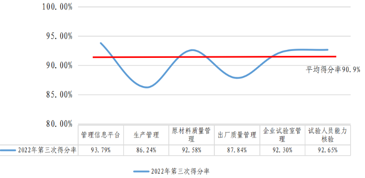 2022年第三次評估現場檢查平均得分為90.66分,較2022年第二次評估提高0.22分。無95分以上的企業;95分~90分(含)之間的企業有71家,占總數的74.74%;90分~85分(含)之間的企業有19家,占總數的20.00%;85分~80分(含)之間的企業有4家,占總數的4.21%;80分以下企業有1家,占總數的1.05%。