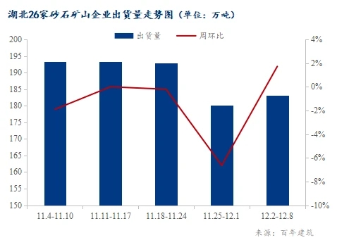 據百年建筑網調研湖北砂石生產企業26家(調研期12.2-12.8),出貨量共183.22萬噸,環比上升1.72%,其中碎石占62%,機制砂占30%,石粉占8%。目前湖北的城市疫情管控有所放開,砂石運輸相較于前期有所恢復。
