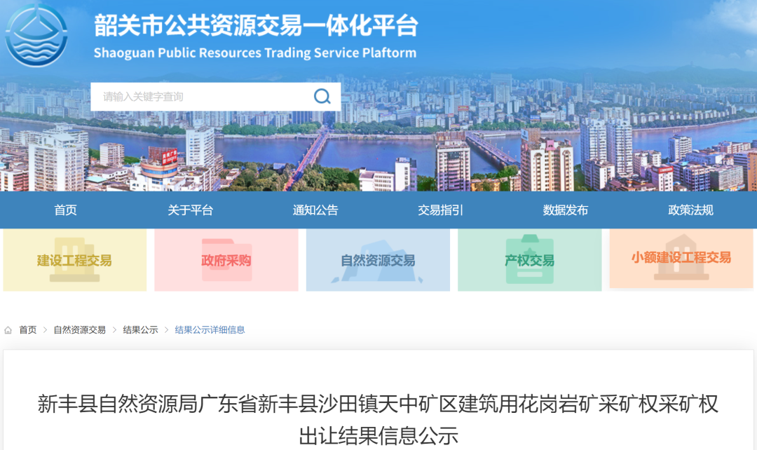 新豐縣自然資源局于2022年11月29日在廣東省公共資源交易平臺(韶關市)、韶關市公共資源交易一體化平臺掛牌出讓廣東省新豐縣沙田鎮天中礦區建筑用花崗巖礦采礦權,2022年12月14日掛牌結束,現將該采礦權掛牌出讓結果的主要事項公示如下: