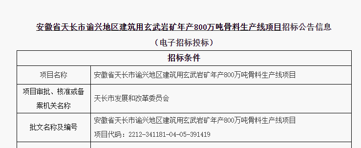 近日,天長市城市投資控股集團有限公司發布年產800萬噸骨料生產線項目EPC總承包工程招標公告。該項目位于安徽滁州天長市金集鎮,招標工程總投資2.2億元,包含設計、采購、施工、質保期內維保服務等全過程。另外,該項目要求從簽署開工令起180日歷天內工程完工且完成系統負荷聯動調試。共計一個標段,不接受聯合體投標。報名時間2022年12月13日至2023年1月3日。