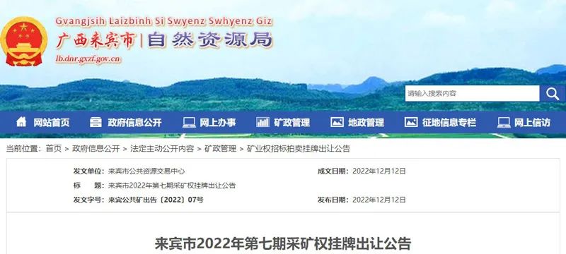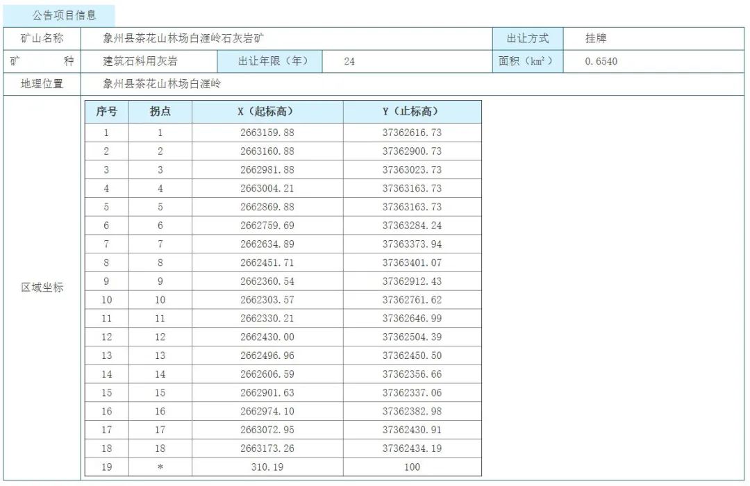 12月12日,廣西來賓市掛牌出讓一建筑石料用灰巖礦,該礦區面積0.654平方公里,資源儲量12409.76萬噸(約1.24億噸),年生產規模500萬噸,出讓年限24年,起始價17530萬元(約1.75億元)。